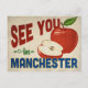 Una encantadora postal de viaje vintage de Manchester New Hampshire con una hermosa manzana roja, junto con un divertido texto de estilo retro que dice: "Nos vemos en Manchester"