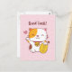 Un garabato de un Maneki Neko, un gato japonés de buena suerte con una pata elevada en un gesto de señas y sosteniendo una moneda de Koban con las palabras "招 福" (shoufuku) escritas en él, que significa "invitar a la buena suerte". El texto dice "¡Buena suerte!" Fondo rosa y blanco de repetición de ondas patrón. ¡Perfecto para todo aquel que ame la cultura y los gatos japoneses!
