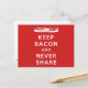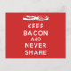 Mantén A Bacon Y Nunca Comparte. ¿Devoradoras ráfagas de tocino tranquilamente? ¡NUNCA! ¡Mío, mío, mío! Basado en el Poster de la Segunda Guerra Mundial, "MANTENGA CALMA Y SIGA". Texto blanco e imagen sobre un fondo rojo. "MANTENGA BACON Y NUNCA COMPARTA".