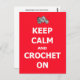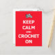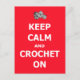 Una postal de "Keep calm and crochet on", en rojo y decorada con una hilera en blanco y negro de lana y dos ganchos rojos.
