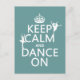 Se lee Keep Calm and Dance On, al estilo del clásico poster de calma. Hay dos bailarinas de ballet bailando sobre las palabras. Es un diseño delicado y bello, que gusta a todos los que aman el ballet y el baile.