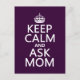 Se lee Keep Calm y Ask Mom, en el estilo del clásico poster mantener la calma. Es un gran consejo en tiempos de calamidad o emergencia. Este diseño es popular entre todos y hace grandes regalos y tarjetas para ser madre el domingo, o en cualquier época del año. Puede cambiar el color de fondo muy fácilmente, sólo pulse personalizar. Si quieres cualquier otro cambio - o ver el diseño en un producto diferente - o si solo tienes alguna pregunta, por favor ponte en contacto a través de mi tienda y te ayudaré de cualquier manera que pueda. Muchas gracias por mirar.