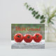 Manténganse Sanos con tres tomates rojos en una pared blanca frente a la naturaleza verde
