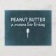 Mantequilla de maní, una razón para vivir. Si eres un fanático de la mantequilla de maní, entonces sabrás lo cierto que es este divertido diseño de comida. Tablero azul con cuchara y texto en gris angustiado.