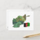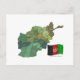 Esta postal tiene el mapa y la bandera de Afganistán con un mapa que muestra todas las provincias. Cada provincia se muestra en un tono verde diferente y se etiqueta con el nombre de la provincia. La bandera afgana se muestra ondeando y debajo de la bandera están las palabras "República Islámica del Afganistán".
