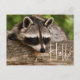 Una postal con una fotografía de un mapache lindo y curioso descansando su cara en un tronco de madera. Adorable.