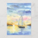 Mar al atardecer. Un bonito yate sale de la bahía y va al mar. El ilustracion acuarela fue dibujado y escaneado. Paisaje acuático hecho al aire libre en 2024.