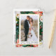 Tarjeta de agradecimiento de foto de boda de novia y novio elegante con flores de invierno en acuarela y vegetación, incluye poinsettias rojas, rosas blancas, bayas de acebo y vegetación botánica. Marco dorado.