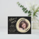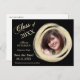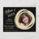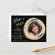 Hay un marco de círculo pintado de oro elegante para tu fotografía en el lado derecho de esta invitación de graduación "Save the Date", con el texto de tu personalizado en oro a la izquierda. Todo se coloca sobre un fondo negro dramático. La parte posterior de la tarjeta tiene un campo de texto adicional si es necesario. Todo el texto en la parte delantera también se personaliza fácilmente.