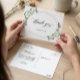 Esta exclusiva Tarjeta de Agradecimiento cuenta con un Marco Geométrico Moderno y Hojas de Eucalipto con algunos confetis brillantes en la esquina. Personalice esta plantilla para que sea única y exprese su agradecimiento a sus invitados, amigos y familiares.