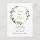 Este elegante y personalizable Save the Date presenta un marco geométrico de oro adornado con hojas de eucalipto de acuarela húmeda y ha sido emparejado con una caligrafía caprichosa y un tipo de letra serif elegante en oro y gris, con una tarjeta postal de vuelta. Para realizar cambios avanzados, seleccione la opción "Hacer clic para más personalizares" en Personalizar esta plantilla.