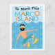 Una divertida imagen de viaje al estilo personalizado de Marco Island Florida con un hipster buceador bajo el agua. En azul naranja y turquesa.