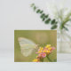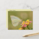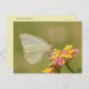 Postal con vista lateral de una mariposa blanca bonito sobre flores de lantana rosadas y amarillas en un día de verano. Foto tomada en Pasadena, California.