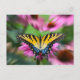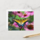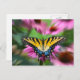 Fotografía de una mariposa amarilla de cola tortuga que aterriza en un parche de flores moradas.
