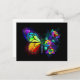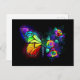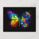 Arcoiris, mariposa monarca luminosa, pintada de forma artística con ramo de iridiscente, rosas brillantes y luminiscentes sobre fondo negro. Mariposa arcoiris.