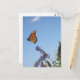 Mariposa monarca despegada de un arbusto de mariposa contra un cielo azul