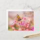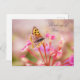 Una pequeña mariposa de cobre con alas naranjas y negras moteadas descansa delicadamente sobre flores rosadas brillantes. El fondo suave añade un toque soñador a la escena, realzando la belleza natural y la tranquilidad. Esta tarjeta postal de “Pensando en ti” se puede personalizar si lo deseas.