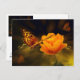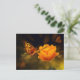 fotografía de color de un hermoso color de mariposa con alas verificadas de oro y marrón volando y acercándose a la punta de un pétalo de una hermosa flor amarilla en un jardín con cinta de bonito como rizos detrás de la mariposa como si mostrara su movimiento mientras se mueve hacia la flor naranja y dos mariposas bonito a la distancia oscura con hermosas alas de patrón de tigre