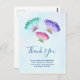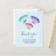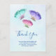 Tarjeta de agradecimiento con un delicado diseño femenino. 3 mariposas de acuarela, pintadas de rosa, púrpura y verde. Un fondo de acuarela azul claro con toques de rosa claro.
