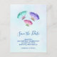 Guarde la postal de fecha con un diseño delicado. 3 mariposas acuarelas, rosas, violetas y verdes. Fondo de color azul oscuro.