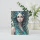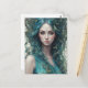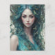 Una mujer con el pelo azul que fluye está rodeada de mariposas y hojas, creando una atmósfera mística y etérea. Su serena expresión y los colores vibrantes transmiten un sentido de armonía con la naturaleza.