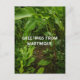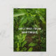 This vibrant green postcard features an intriguing photo of a lush green garden with exotic plants.