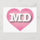 Esta postal tiene un corazón tranquilo, fresco y recogido de color rosa con un centro blanco lavado que contiene las letras negrita, blanca y alta del funda MD, la abreviatura oficial de Maryland, el estado de la línea antigua. El reverso de la postal está en blanco, esperando el texto personalizado o los sentimientos manuscritos.