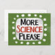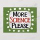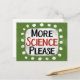 "Más ciencia, por favor" es un lindo diseño de texto en verde con texto en negro y rojo, junto con una forma de acento blanco y puntos caprichosos de textura blanca que lo rodean.