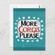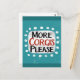 "Más Corgis por favor" es un lindo diseño de texto en azul con texto en negro y rojo, junto con una forma de acento blanco y puntos caprichosos de textura blanca que lo rodean.