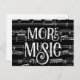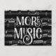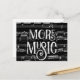 Un diseño ordenado de Más Música con efecto de pizarra con fondo de partitura de notación musical en blanco y negro.