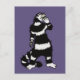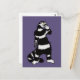 Tarjeta postal de gato espeluznante con un dibujo a tinta que representa a un extraño gatito a rayas negras y blancas con cuello largo que sostiene una máscara de cráneo. Parece que uno de sus guantes está fuera y su mano esquelética se muestra desde su manga. Me hace preguntarme si es mucho más una criatura espeluznante de lo que pretende ser en Halloween.