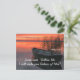 La postal cristiana de la escritura inspiradora muestra una fotografía de la naturaleza que incluye un bote y una hierba marina con una hermosa puesta de sol dorada sobre el agua. Presenta la Biblia Verse Mateo 4:19, "Jesús dijo, "Sígueme, te haré pescadores de hombres". La oración del saludo se puede personalizar según los detalles de su elección.