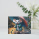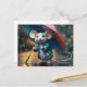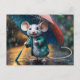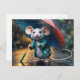 Eine kleine fröhliche Maus steht im Regen mit einem großen Regenschirm. Überall sind Regentropfen, Pfützen und bunte Farbreflektionen zu sehen.