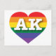Esta postal tiene un corazón con un diseño de orgullo arcoiris y las letras AK. Por encima de las rayas, dentro del corazón están las letras mayúsculas, audaces y blancas AK, la abreviatura oficial de Alaska, la última frontera. Muestra tus verdaderos colores, apoya el matrimonio igualitario y celebra el orgullo gay.