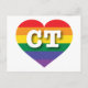 Esta postal presenta un corazón con un diseño de orgullo arcoiris y las letras mayúsculas en negrita, blancas, CT, la abreviatura oficial de Connecticut, el estado de la constitución. El reverso de la postal está en blanco, esperando el texto personalizado o los sentimientos escritos a mano. Muestra tus verdaderos colores, apoya el matrimonio igualitario y celebra el orgullo gay.