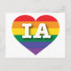 Esta postal tiene un corazón con un diseño de orgullo arco iris y las letras IA. Por encima de las rayas, dentro del corazón están las letras mayúsculas IA, la abreviatura oficial del estado de Iowa, en un audaz tono blanco. El reverso de la tarjeta está en blanco, esperando tu texto personalizado o tus sentimientos escritos a mano. Muestra tus verdaderos colores, apoya el matrimonio igualitario y celebra el orgullo gay.
