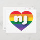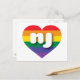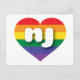 Esta postal tiene un corazón con un diseño de orgullo arcoiris y las letras negrita, blanca, funda inferior nj, una abreviatura juguetona para Nueva Jersey, el estado del jardín. El reverso de la postal está en blanco, esperando el texto personalizado o los sentimientos escritos a mano. Muestra tus verdaderos colores, apoya el matrimonio igualitario y celebra el orgullo gay.