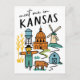 Discover the heart of the Midwest with this charming 'Meet Me in Kansas' postcard, featuring a delightful collection of Kansas icons in a fun doodle style! This whimsical illustrated postcard captures the essence of the Sunflower State, showcasing everything from golden corn fields and a friendly scarecrow to a classic windmill, a majestic capitol building, and a cozy farm scene. The playful illustrations and clear lettering make this postcard a unique and memorable tribute to Kansas, USA.