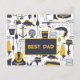 Por el Día del Padre. "Mejor papá" en oro en rectángulo azul. Un patrón de equipo de pesca que incluye peces, ganchos, cubos, red, motor de barco, varilla y carrete y mucho más. Ideal para los amantes de la pesca