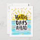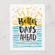 Alentar a alguien a pasar por tiempos difíciles con este diseño tipográfico de estilo alegre y con letras a mano que presenta el mensaje en letras negras, con letras de broche, "Better Days Ahead" rodeado por el sol de las acuarelas con rayos y estrellas y olas de océano azul claro.