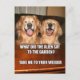 Esta divertida postal de memes muestra una fotografía de dos perros recuperadores de oro que se están riendo de un chiste. El chiste dice: "¿Qué le dijo el alien al jardín? Llévame a tu sabueso". El texto de la parte posterior dice: "Un chiste para hacerte sonreír", pero esto puede ser cambiado o borrado.