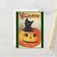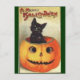 Los gatos llegarán a todas partes, bonita tarjeta vintage de saludo de halloween de un gato sentado en una calabaza.