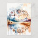 Vibrante pintura acuática con un paisaje sereno con montañas y un tranquilo lago al amanecer. En primer plano, hay una tetera tradicional y una pequeña cabaña rodeada de árboles frondosos. La escena con intrincados patrones tribales, incluyendo dreamcatchers, plumas y formas geométricas, incorporando tonos cálidos de tierra y suaves efectos de acuarela para realzar la atmósfera soñadora. El aspecto general evoca una sensación de armonía con la naturaleza y la cultura indígena.