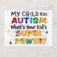 Mensaje positivo de "Mi hijo tiene AUTISMO, ¿cuál es el SUPER PODER de tu hijo?" con coloridos rompecabezas de autismo para apoyar a los niños autistas por el orgullo de mamá y papá.