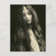 Fotografía vintage de una joven con el pelo muy largo, una mirada seria en su cara mientras mira hacia abajo y una pequeña banda metalizado en la cabeza