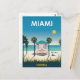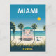 Ilustracion de afiches de viajes Retro Miami Florida con vistas a una estación de socorristas en una playa de Miami con palmeras, soleadas y arenosas. Este diseño vintage traerá recuerdos de afiches clásicos de viajes de una época pasada.