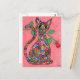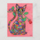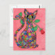 Este hermoso gato se sienta sobre un suave fondo rosado, mostrando sus intrincadas y complejas marcas, similares a las que se encuentran en las cuentas millefiori y en el cristal. En su boca sostiene una sola rosa roja, en este diseño único, edificante y altamente detallado.