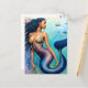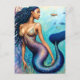 Esta postal presenta obras de arte de una sirena de piel marrón con el pelo largo azul y violeta y cola de pez posando en una escena submarina con peces, algas y coral. ¡Sus ojos están cerrados pues ella sirve pescado feroz! Estética oceánica-core con un chica negro bonito.