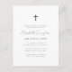 Compuesto por escritura cursiva y tipografía serif; todo sobre un fondo blanco. Una simple cruz decora sutilmente la tipografía. Esta es una invitación de funeral o memorial moderna, simple y limpia.