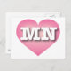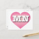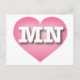 Esta postal tiene un corazón tranquilo, fresco y recogido de color rosa con un centro blanco lavado que contiene las letras negrita, blanca y alta del funda MN, la abreviatura oficial de Minnesota, el estado de la estrella del norte. El lado inverso de la postal está en blanco, a la espera de tus sentimientos escritos a mano o de tu texto personalizado.
